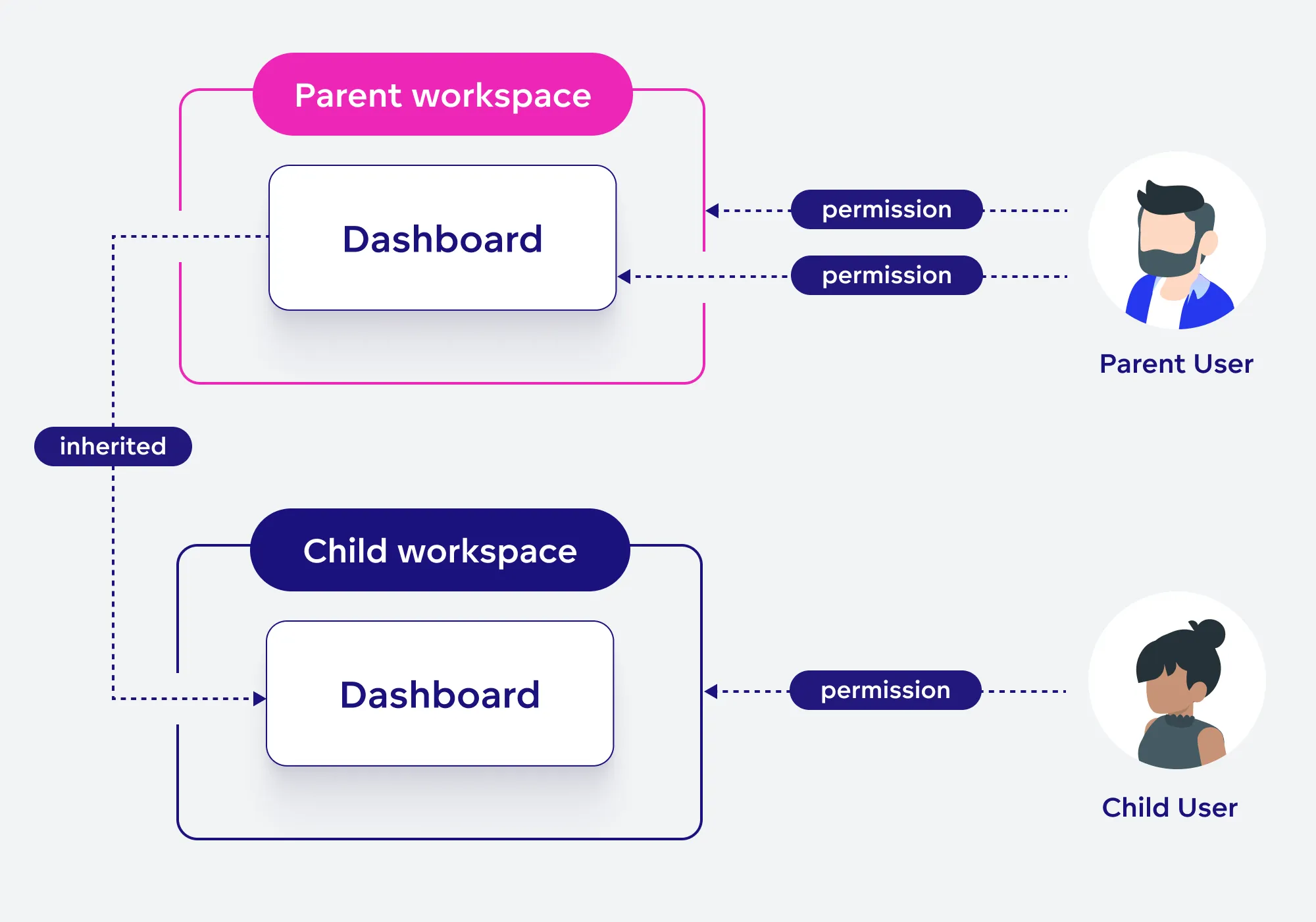 A dashboard is inherited from a parent workspace together with its permissions. In the child workspace, you can extend the inherited permissions by adding new ones. However, you cannot take away inherited permissions in the child workspace.